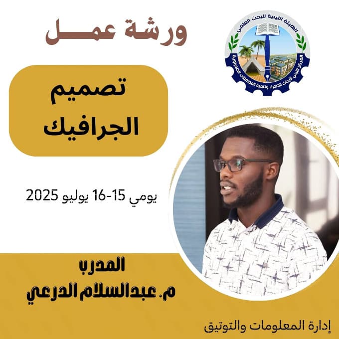 قدّم الورشة م. عبدالسلام الدرعي، وهدفت إلى تطوير المهارات الإبداعية للمشاركين وتمكينهم من استخدام أدوات التصميم بشكل احترافي في إعداد العروض التقديمية والمحتوى البصري الداعم للأعمال البحثية. وقد شهدت الورشة تفاعلًا ملحوظًا من الحضور واهتمامًا كبيرًا بمحتواها التدريبي.