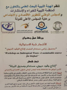 شارك الأستاذ عبدالمنعم عبدالقادر فتاح، عضو هيئة التدريس بالمركز، في ورشة العمل التي أُقيمت بمدينة طرابلس يوم الاثنين الموافق 16 فبراير 2026، برعاية الهيئة الليبية للبحث العلمي، والتي تناولت زراعة شجرتي الجوجوبا والجاتروفا في المناطق الجافة وشبه الجافة.
